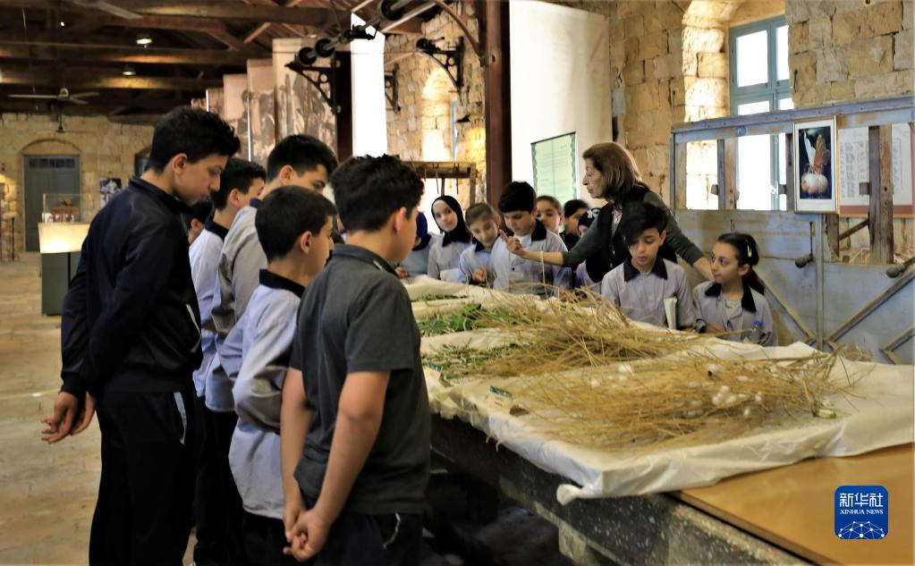 5月17日,在黎巴嫩卜蘇斯絲綢博物館,導游為當地學(xué)生講解。