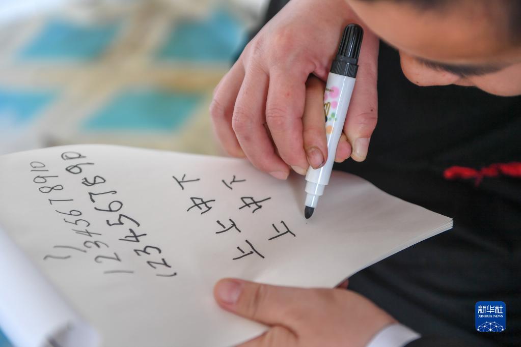 5月17日,在四平市鐵西區小泉眼村,四平市聾啞學(xué)校特教教師楊麗平教學(xué)生徐鶴航寫(xiě)字。