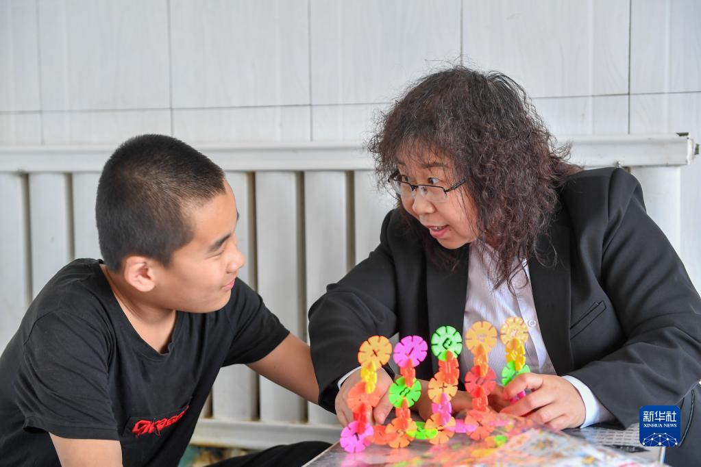 5月17日,在四平市鐵西區小泉眼村,四平市聾啞學(xué)校特教教師楊麗平(右)與學(xué)生徐鶴航進(jìn)行積木識字游戲。