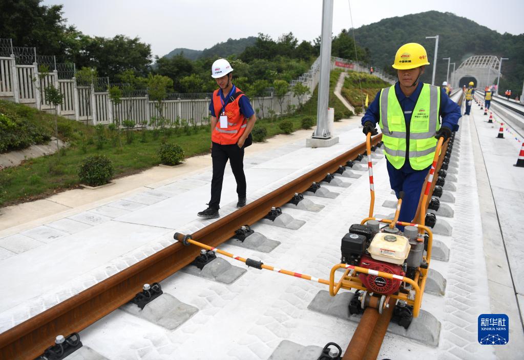 5月18日,中鐵十一局施工人員在池黃鐵路鋪軌施工現場(chǎng)作業(yè)。
