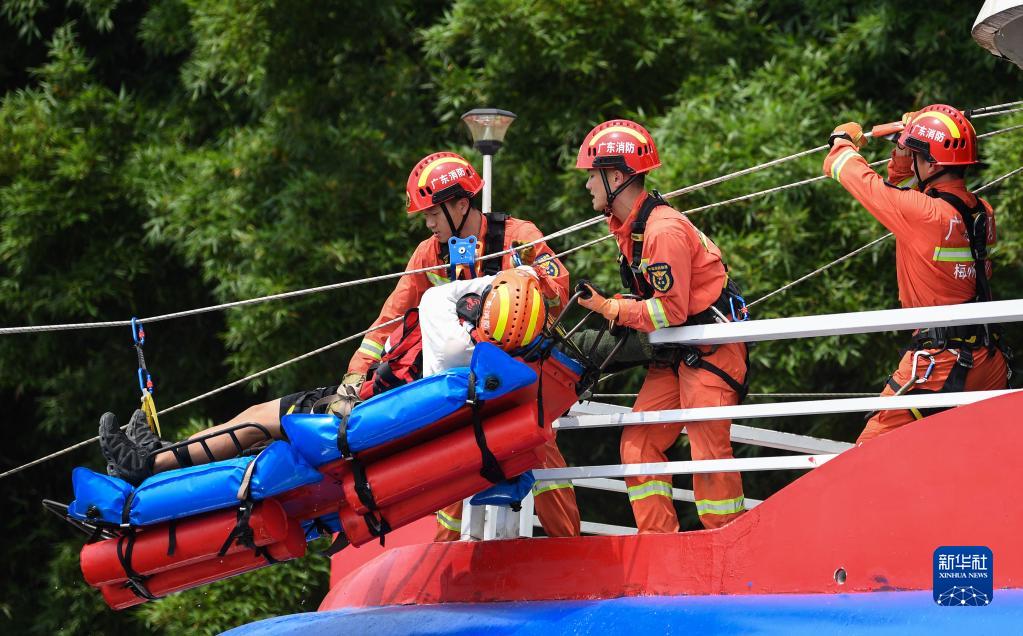 5月18日,參加演練的消防人員通過(guò)繩索和漂浮擔架營(yíng)救“被困群眾”。