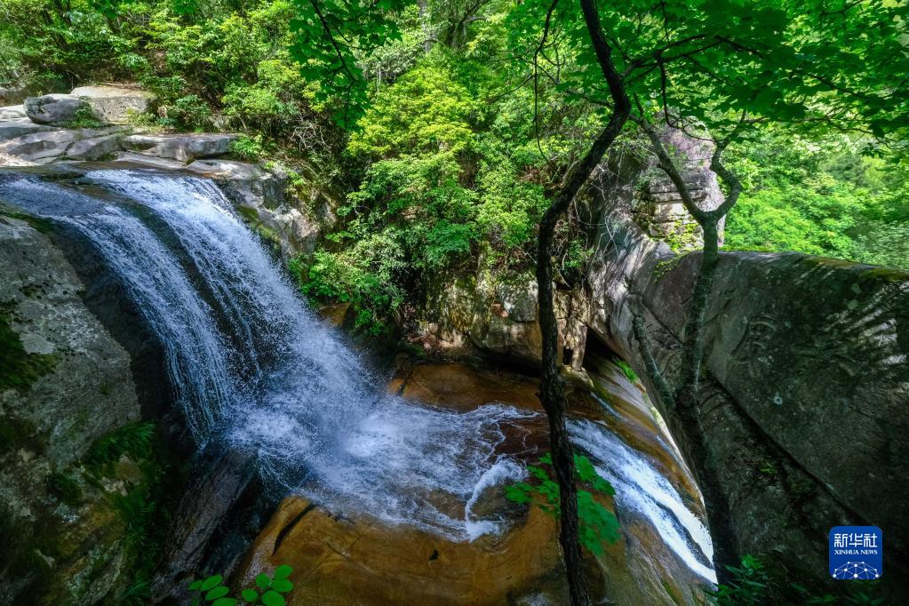 石梁飛瀑一景(5月16日攝)。石梁飛瀑景點(diǎn)有一條巨大石梁橫跨在兩崖之間,瀑布水流從梁底穿過(guò),墜入幽谷之中。徐霞客在游記中寫(xiě)道:“下瞰深潭,毛骨俱悚?!?/p>