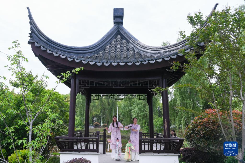 孫菁(右)和施錦芳在蘇州市吳江區七都鎮一處公園內排練(4月18日攝)。