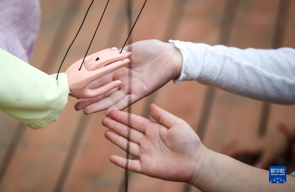 在七都幼兒園,小朋友與提線(xiàn)木偶互動(dòng)(4月20日攝)。