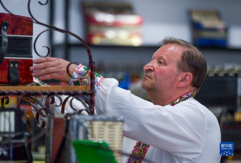 在位于伊寧市六星街的亞歷山大手風(fēng)琴珍藏館,亞歷山大在整理擺放手風(fēng)琴(5月16日攝)。