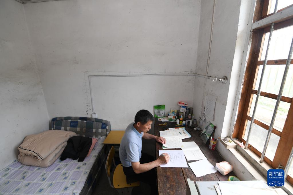 5月18日,在廣西靈川縣蘭田瑤族鄉深潭教學(xué)點(diǎn),趙洪老師在學(xué)校辦公室兼臥室里備課。