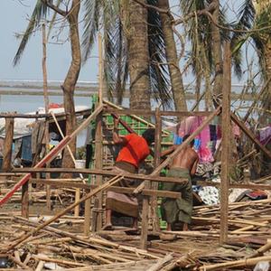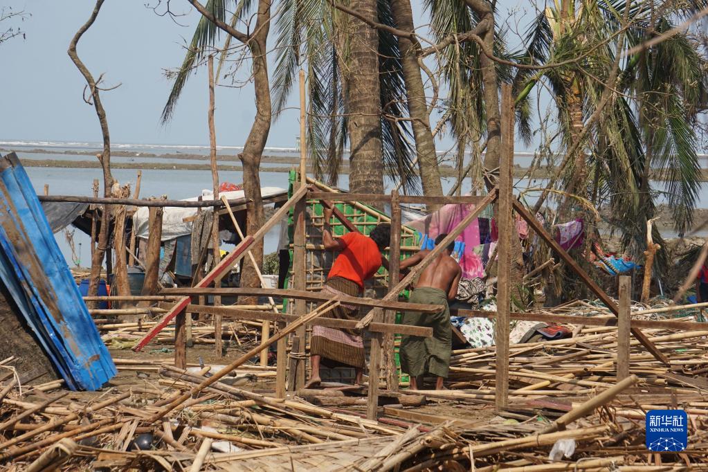 5月17日,在緬甸實(shí)兌,村民在熱帶氣旋“穆查”造成的廢墟上重建房屋。