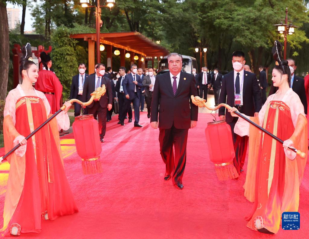 5月18日晚,出席中國-中亞峰會(huì )的中亞國家元首夫婦陸續抵達陜西省西安市大唐芙蓉園,參加在這里舉行的歡迎儀式。這是塔吉克斯坦總統拉赫蒙抵達。新華社記者 徐子鑒 攝