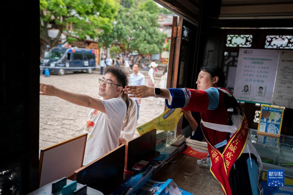 5月18日,一名志愿者(右)在麗江古城一處旅游綜合服務(wù)亭為游客指路。