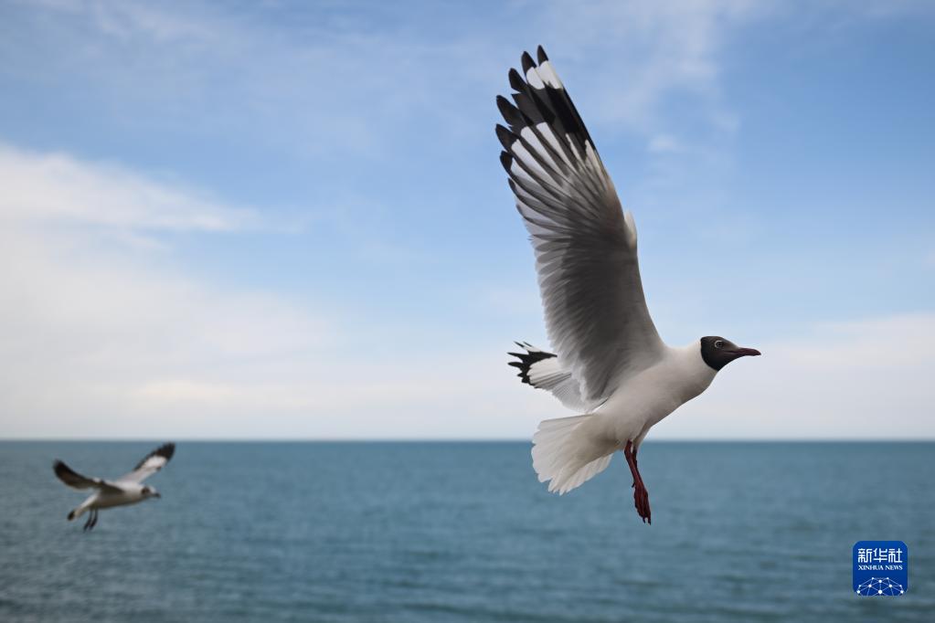 這是5月17日拍攝的在青海省海南藏族自治州共和縣黑馬河鎮境內青海湖上飛翔的棕頭鷗。