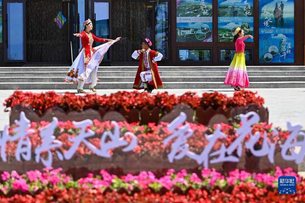 工作人員在新疆伊犁哈薩克自治州伊寧縣天山花海國家農業(yè)產(chǎn)業(yè)園跳起舞蹈歡迎遠方來(lái)客(5月18日攝)。