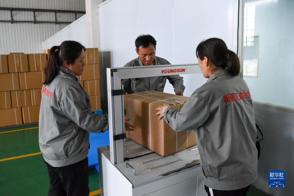 工作人員在位于新疆伊犁哈薩克自治州的新疆匯嘉生物科技有限公司生產(chǎn)車(chē)間包裝甜葉菊產(chǎn)品(5月17日攝)。