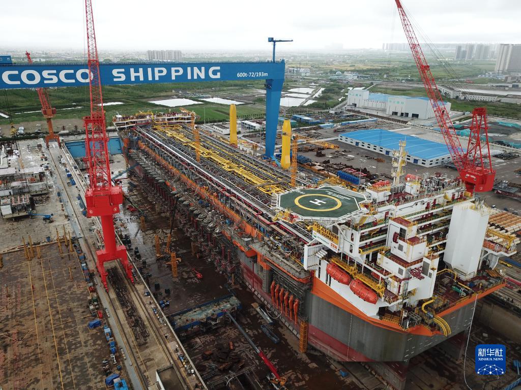 5月19日在江蘇省南通市啟東海工船舶工業(yè)園拍攝的,啟東中遠海運海洋工程有限公司正在建造的世界最大噸位級新型海上浮式生產(chǎn)儲卸油船(無(wú)人機照片)。