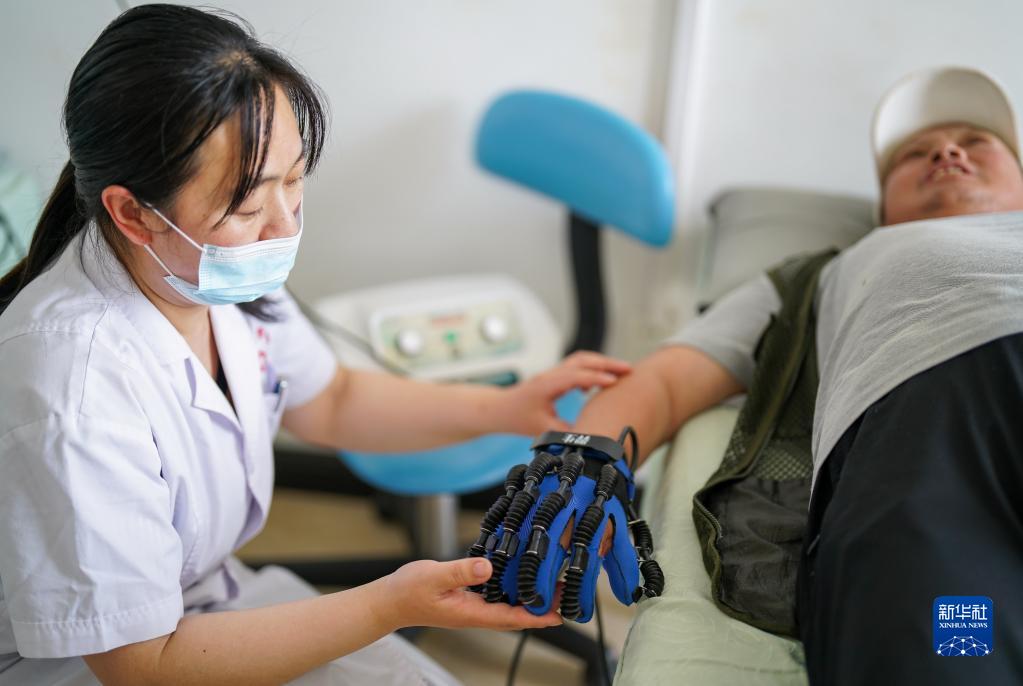 5月19日,河北省灤南縣一家養老機構的工作人員利用醫療器械為偏癱老人進(jìn)行康復訓練。