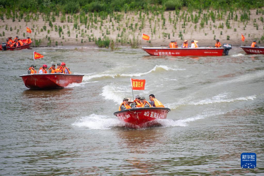 5月19日,在洞庭湖區防汛搶險應急救援演練中,參演人員駕駛沖鋒舟進(jìn)行群眾緊急轉移演練。