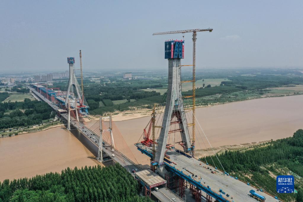 這是成功封頂的濟南黃河公路大橋擴建工程南岸主塔(右)(5月19日攝,無(wú)人機照片)。