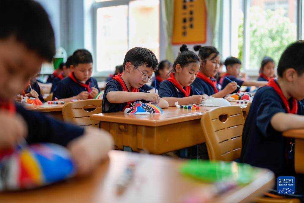 5月19日,河北省灤南縣第一實(shí)驗小學(xué)手工社團的學(xué)生在給京劇臉譜上色。