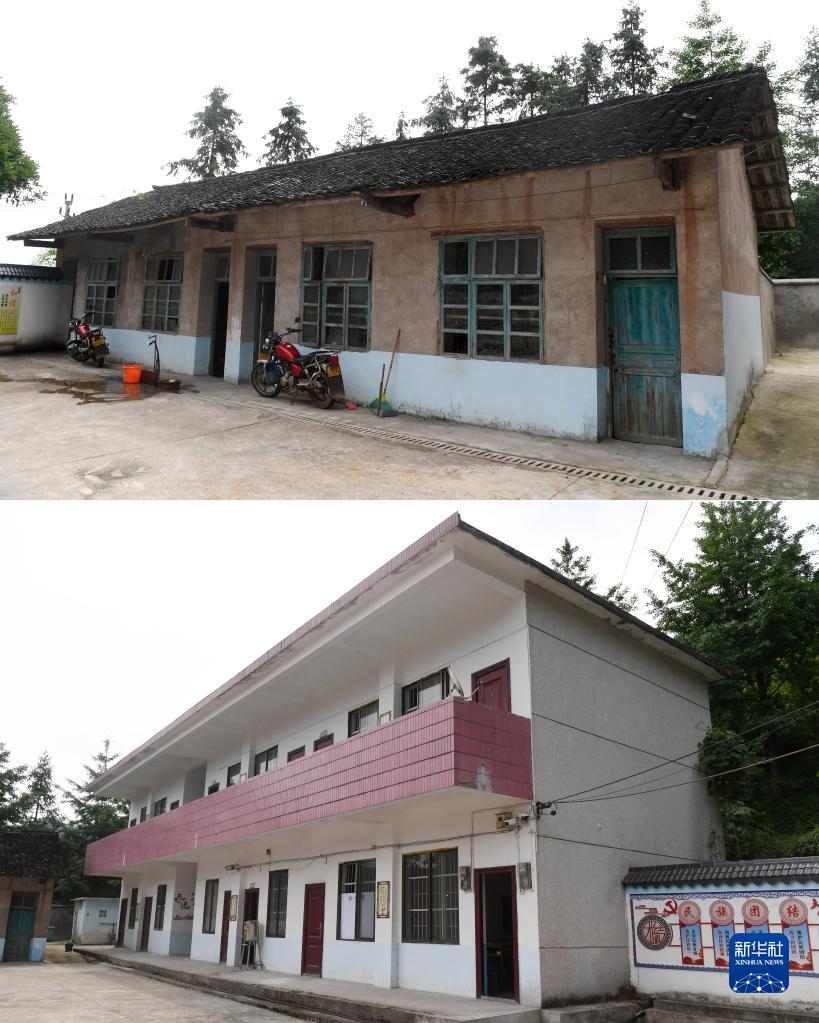 這是一張拼版照片:上圖為廣西靈川縣大境瑤族鄉金竹教學(xué)點(diǎn)舊教室(5月19日攝);下圖為廣西靈川縣大境瑤族鄉金竹教學(xué)點(diǎn)新教室(5月19日攝)。