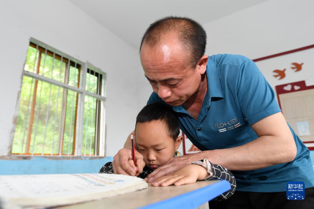 5月19日,在廣西靈川縣大境瑤族鄉金竹教學(xué)點(diǎn),李忠華教一名學(xué)生寫(xiě)字。