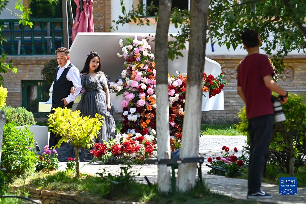 游客在伊寧市六星街拍攝婚紗照(5月19日攝)。