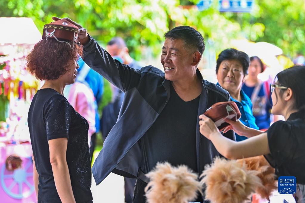 游客在伊寧市六星街選購花帽(5月19日攝)。