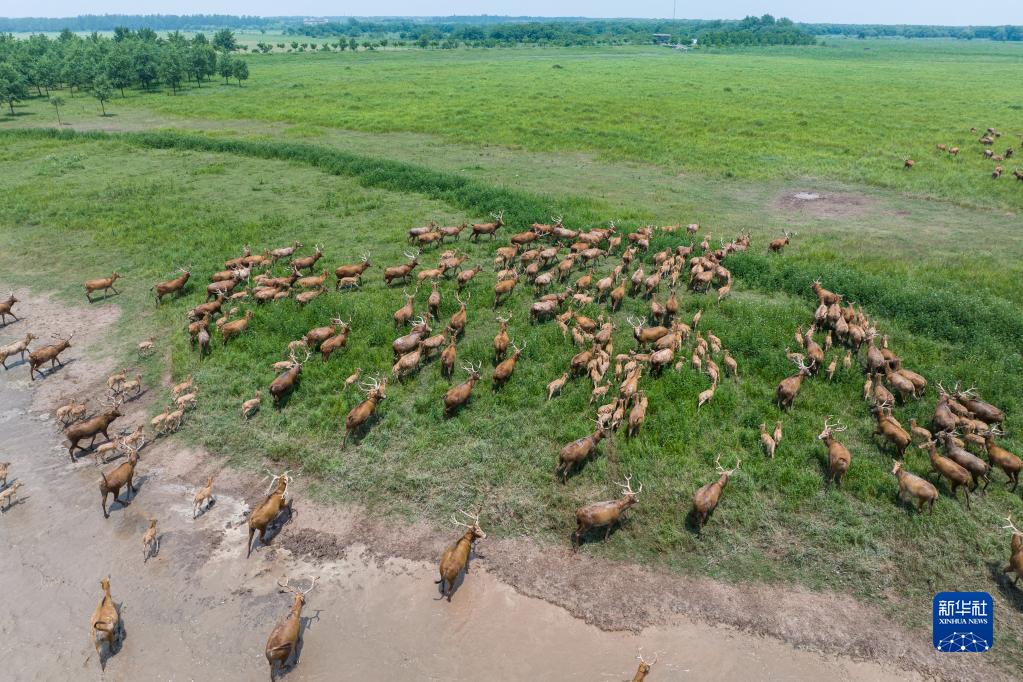 5月19日,一群麋鹿在湖北石首麋鹿國家級自然保護區內活動(dòng)(無(wú)人機照片)。