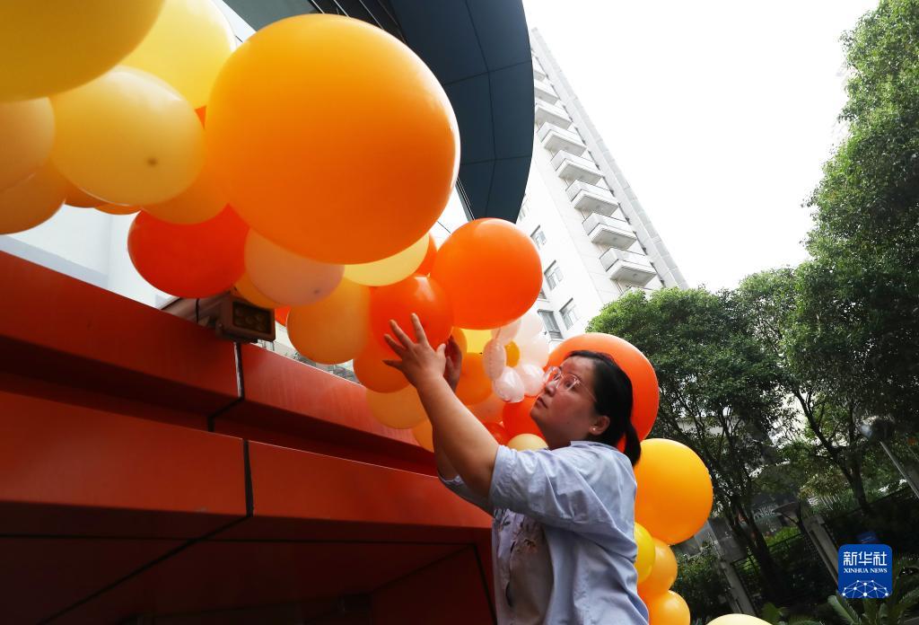 在上海虹口區青少年活動(dòng)中心,劉瑩為一場(chǎng)活動(dòng)搭建的氣球拱門(mén)調整位置(5月18日攝)。