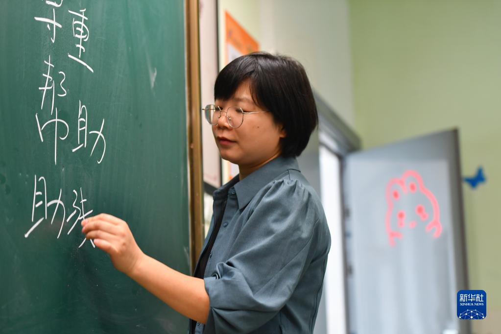 在湘潭市雨湖區風(fēng)車(chē)坪學(xué)校,扶婷向五年級學(xué)生分享她的助殘故事時(shí)在黑板上寫(xiě)下助殘關(guān)鍵詞(5月19日攝)。