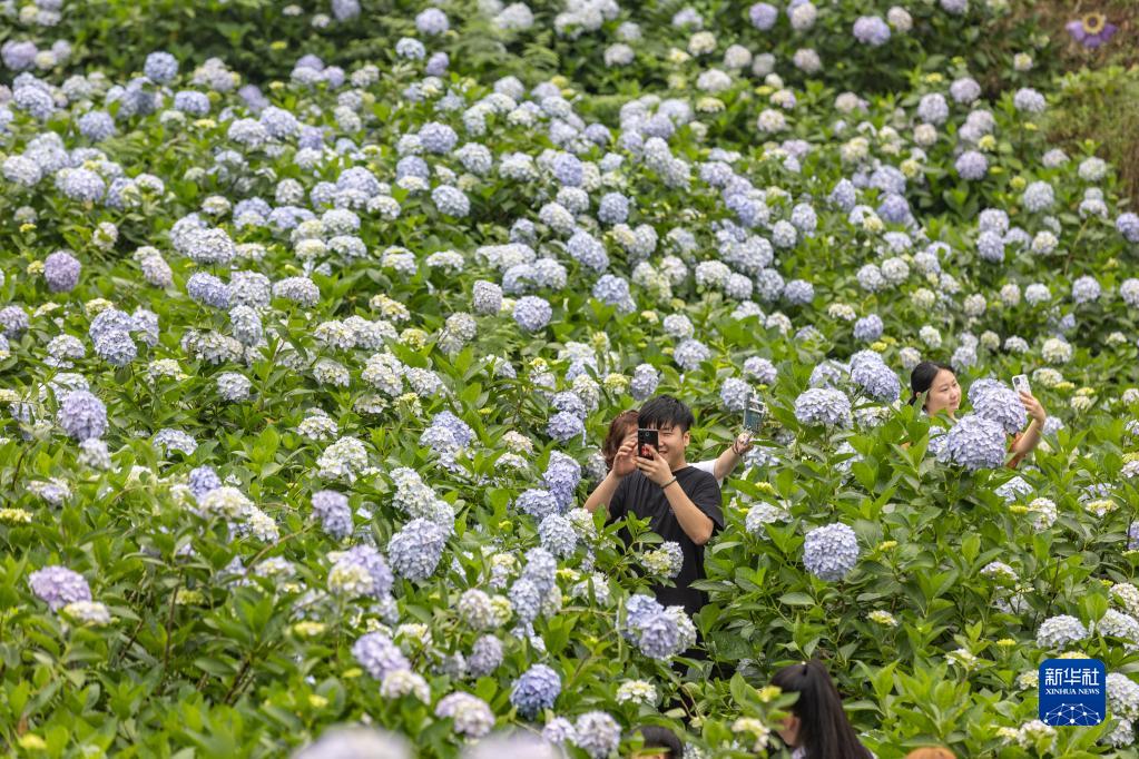 5月20日,游客在柏樹(shù)村繡球花基地游玩、拍照。