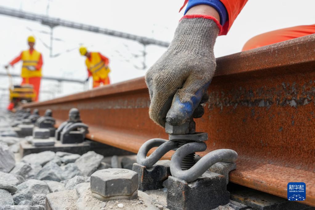 5月20日,在滬寧沿江高鐵太倉站施工現場(chǎng),中鐵十二局的工程人員準備進(jìn)行螺栓緊固作業(yè),將對接好的鋼軌固定。
