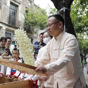 5月21日,在茶文化非遺項目展示交流活動(dòng)上,工作人員引導小朋友體驗福州茉莉花茶窨制工藝。