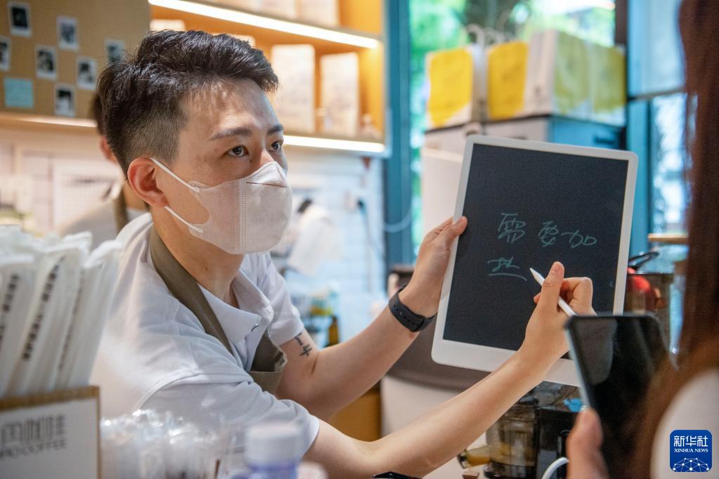 5月5日,在位于重慶市渝北區松山醫院內的一角咖啡廳內,張凌云與顧客通過(guò)小黑板進(jìn)行交流。