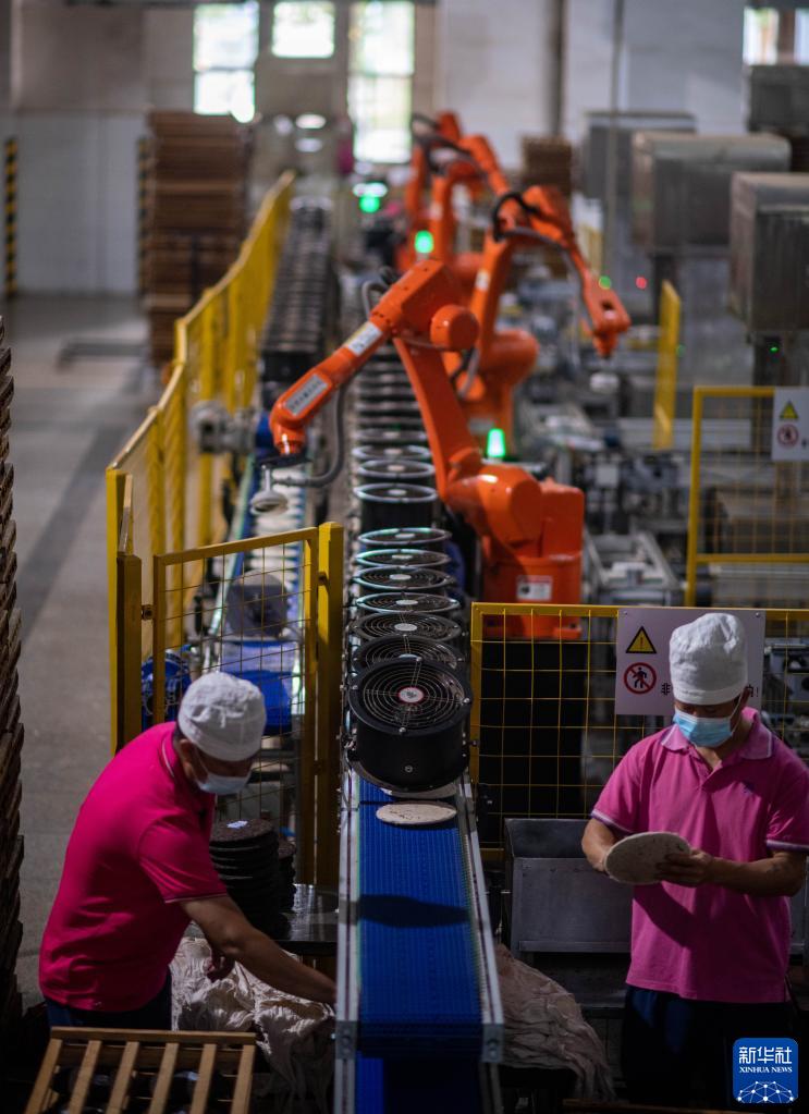 這是2023年5月18日,中國云南省勐??h勐海茶廠(chǎng)的工人在自動(dòng)機械臂的協(xié)助下分揀包裝普洱茶餅。