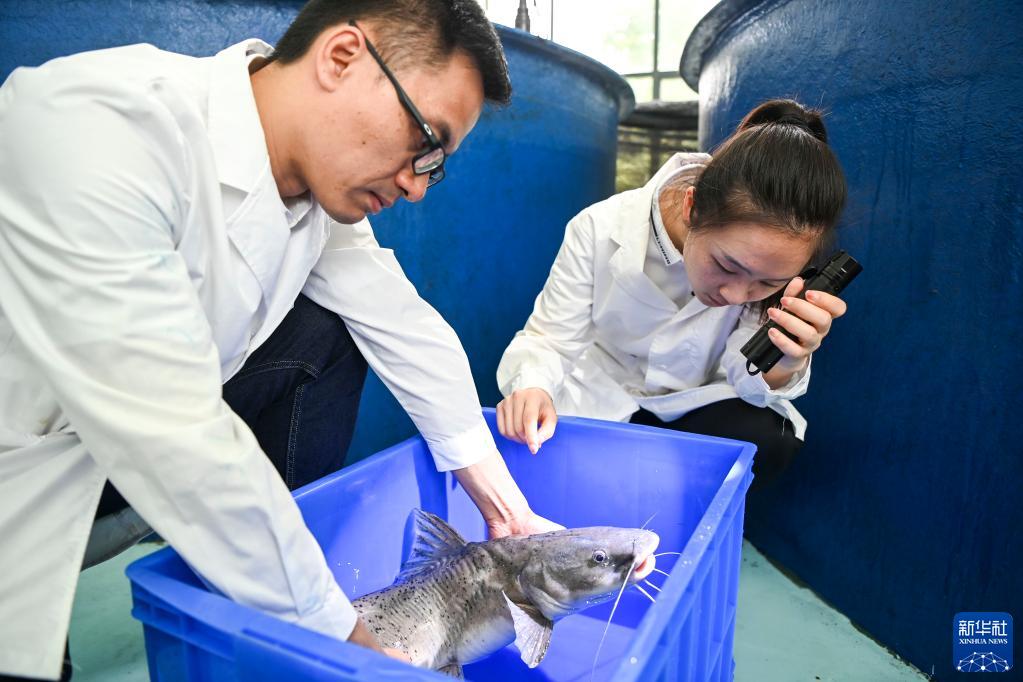 5月20日,科研人員在廣西大藤峽水利樞紐工程魚(yú)類(lèi)增殖放流站檢查野外救助回來(lái)的國家二級重點(diǎn)保護野生動(dòng)物斑鳠的恢復情況。