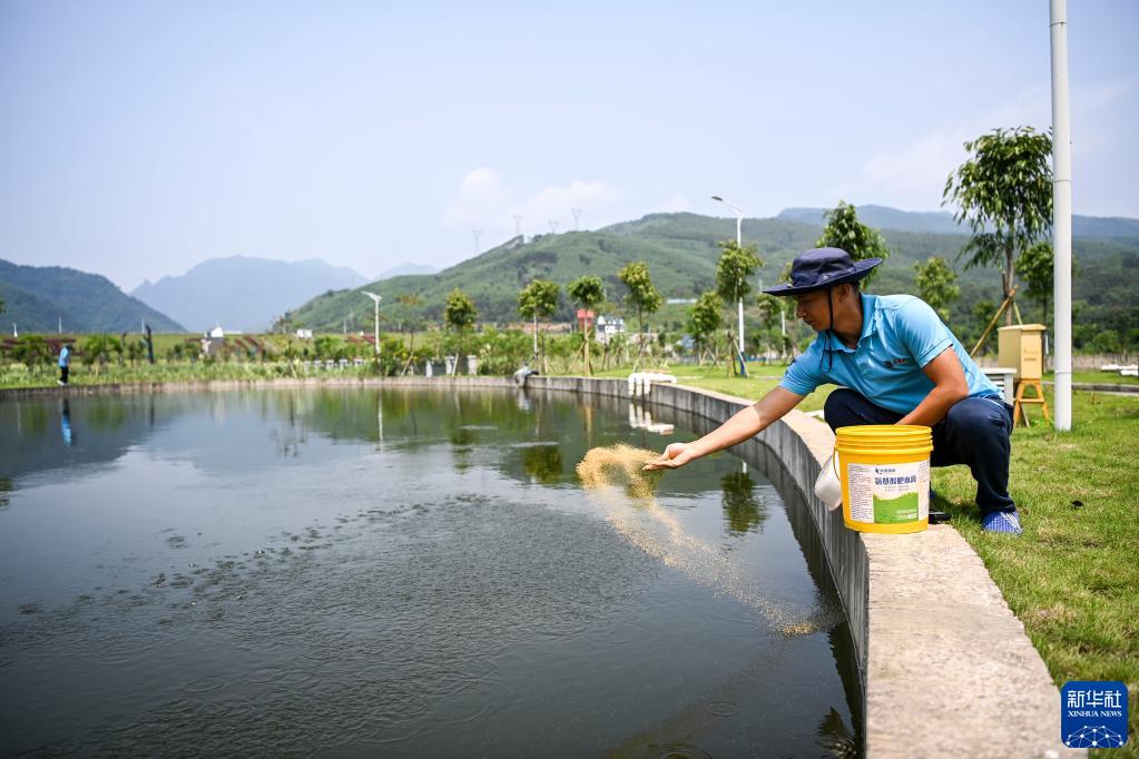 5月20日,技術(shù)人員在廣西大藤峽水利樞紐工程魚(yú)類(lèi)增殖放流站向戶(hù)外育魚(yú)池內投喂飼料。