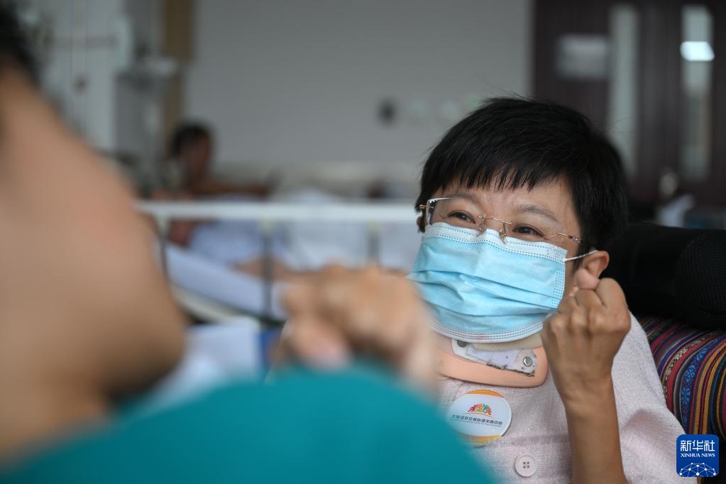 在天津市武清區人民醫院病房?jì)?,魏瑞紅鼓勵正在住院的病友(5月19日攝)。