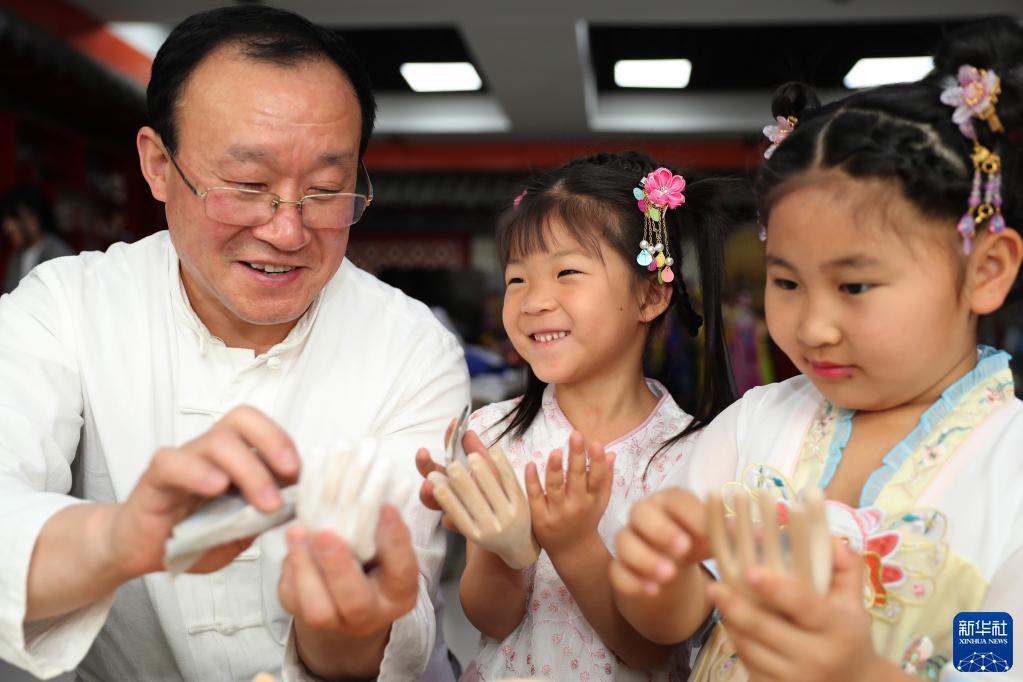 5月21日,在山東青島,姜玉濤給小朋友展示木偶制作工藝。