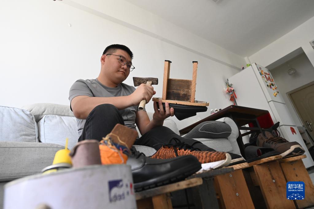 趙強在家里修理“板凳鞋”(4月18日攝)。
