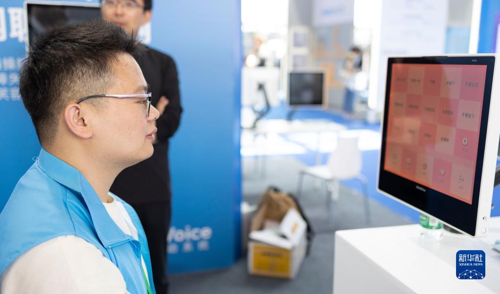 5月21日,在2023中國國際福祉博覽會(huì )上,一名工作人員演示“mind voice”心語(yǔ)眼動(dòng)系統。該系統可讓殘障人士通過(guò)注視屏幕并轉動(dòng)眼球實(shí)現與他人溝通需求、輸入文字等。