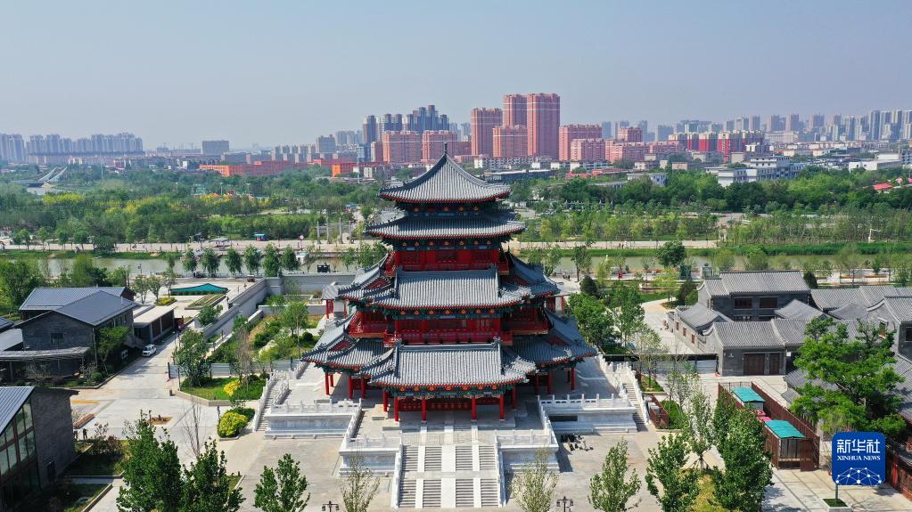 滄州市京杭大運河畔的南川樓(5月16日攝,無(wú)人機照片)。