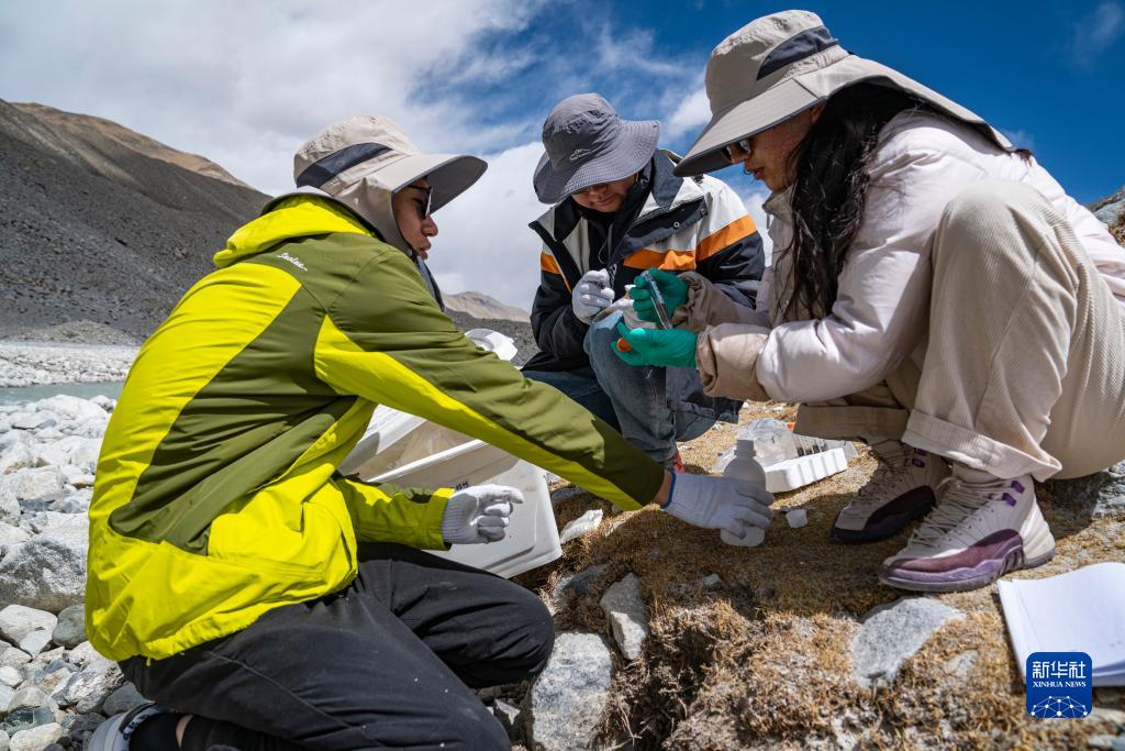 在珠峰登山大本營(yíng)附近,科考隊員收集土壤樣本(5月22日攝)。
