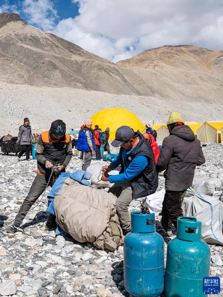 在珠峰登山大本營(yíng),牦牛工捆扎待運輸的物資(5月18日攝)。