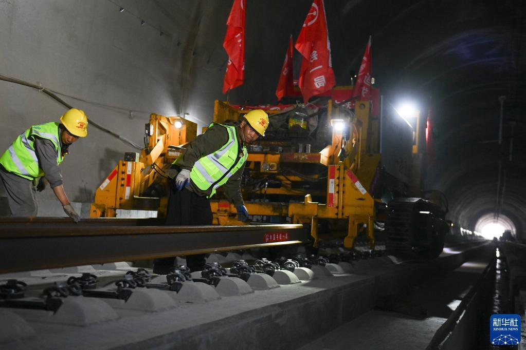 5月22日,中鐵一局建設者在金甬鐵路樓勝隧道內進(jìn)行鋪軌作業(yè)。