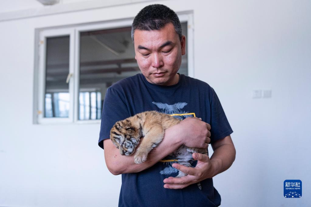 5月22日,在黑龍江東北虎林園的虎舍中,飼養員查看東北虎幼崽生長(cháng)狀況。