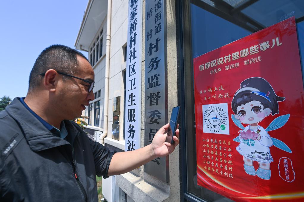 5月23日,在長(cháng)興縣畫(huà)溪街道姚家橋村村委會(huì )大門(mén)口,村民掃碼進(jìn)入線(xiàn)上廉心工作室反映村級政務(wù)公開(kāi)等相關(guān)問(wèn)題。