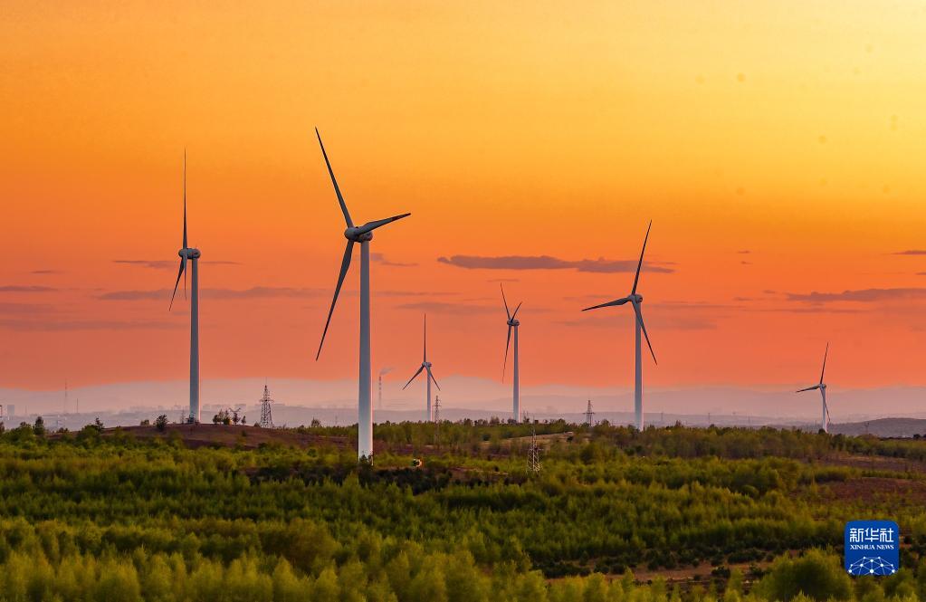5月23日清晨拍攝的興安盟烏蘭浩特市呼和馬場(chǎng)風(fēng)力光伏發(fā)電場(chǎng)內的風(fēng)機。