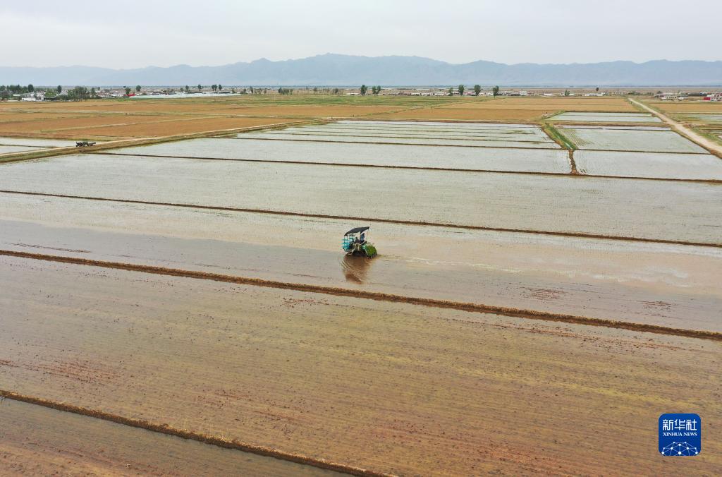 5月23日,達拉特旗昭君鎮村民在鹽堿地改良水稻田中使用農機插秧(無(wú)人機照片)。