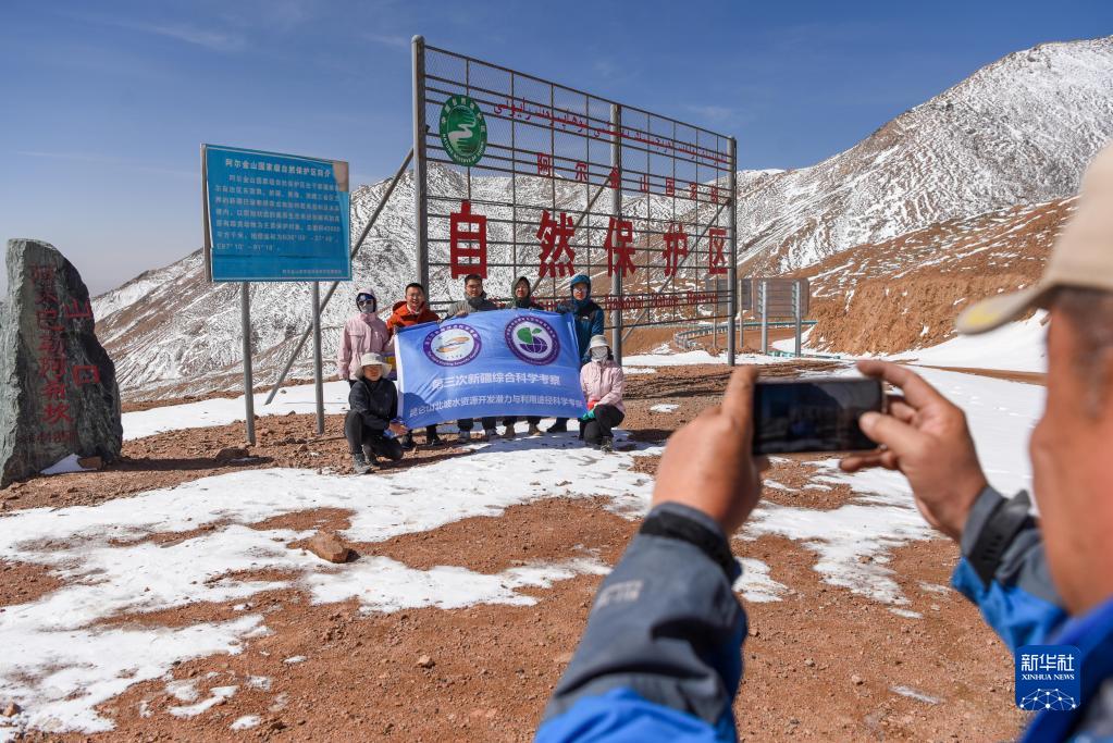 科考隊員在新疆東昆侖庫木庫里盆地內的阿爾金山國家級自然保護區合影留念(5月23日攝)。