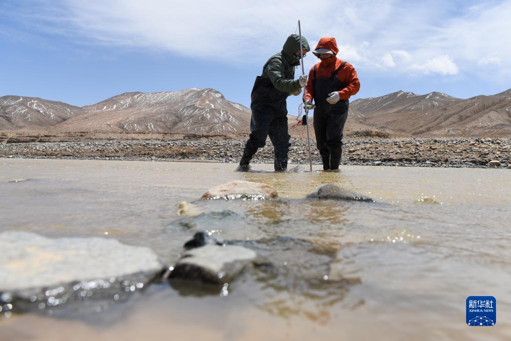 科考隊員在新疆東昆侖庫木庫里盆地利用手持流量計測量河流流速和過(guò)水斷面(5月22日攝)。