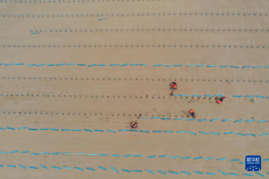 5月24日,機械工程車(chē)輛在達拉特旗庫布其沙漠中施工(無(wú)人機照片)。